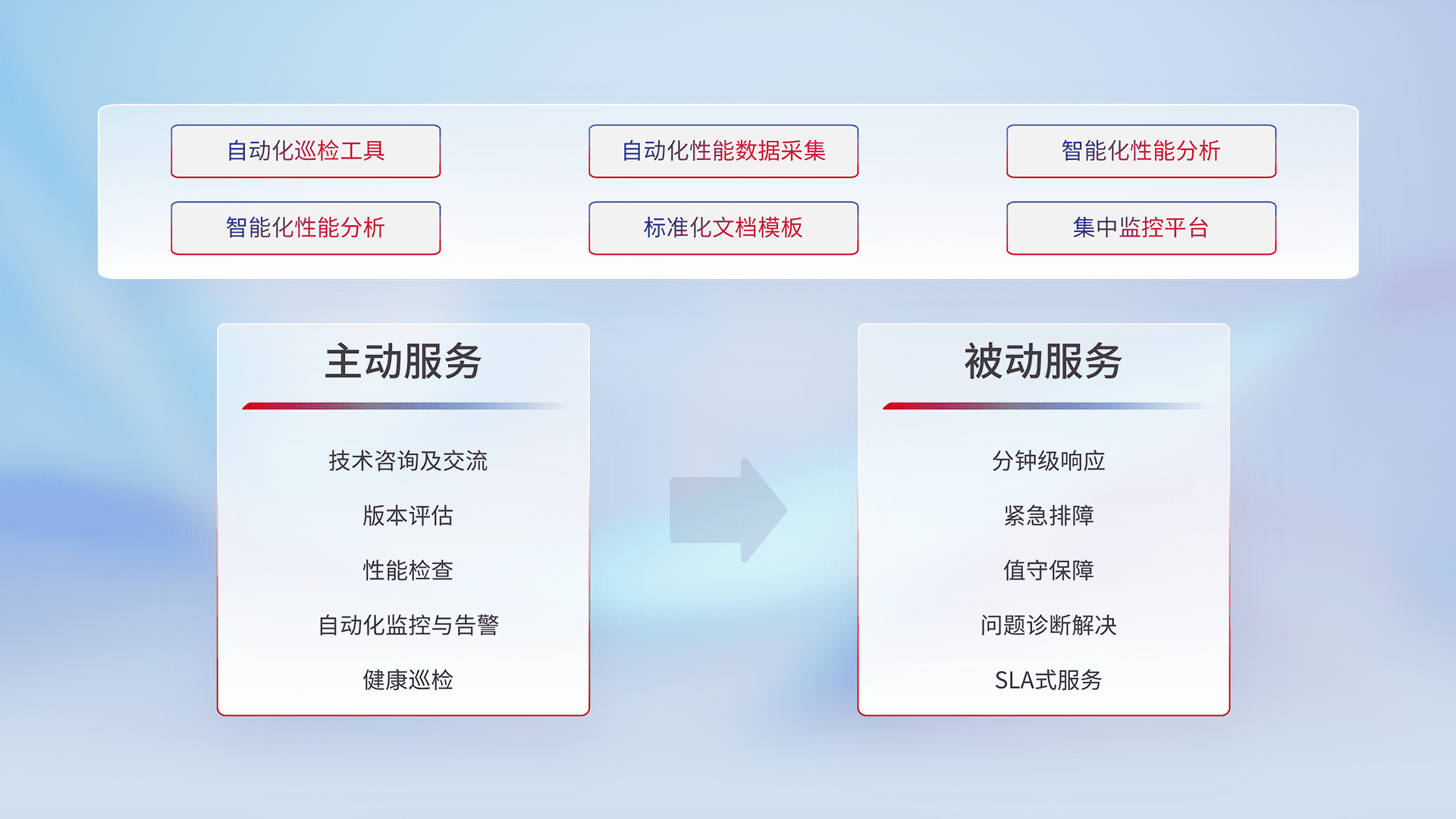 智能化工具和标准化文档,,,保障服务质量,,提供主动服务(包含技术咨询、、、、版本评估、、性能检查、、、、自动化监控与告警、、健康巡检)和被动服务包含(分钟级响应、、、紧急排障、、、值守保障、、、、问题诊断解决、、、SLA服务)。。